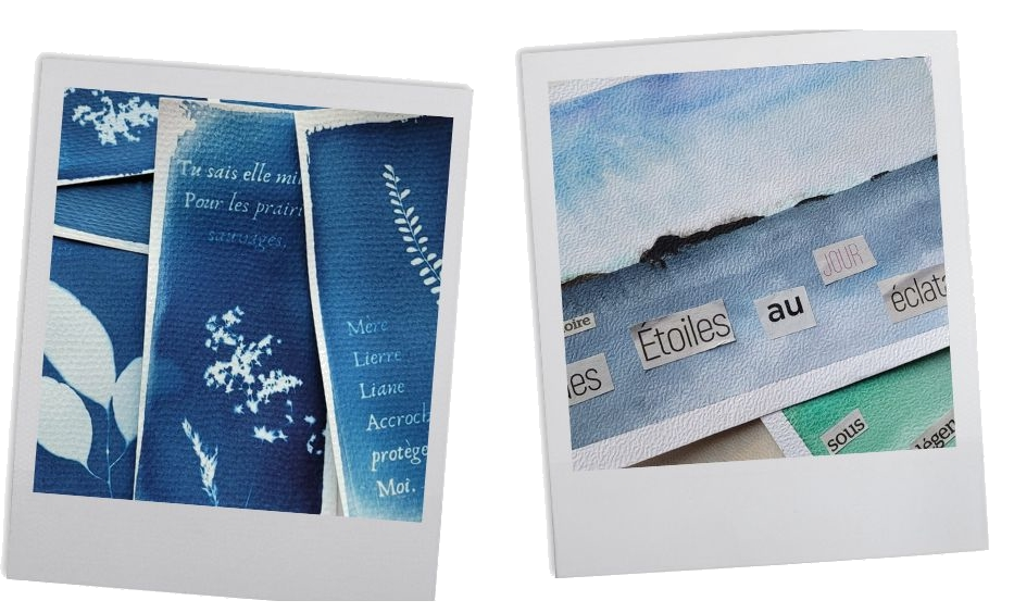 Cyanotype, la poésie végétale… Choisissez vos végétaux, un extrait des paroles de Noir Montagne et composez votre marque-page ou votre carte postale poétique.